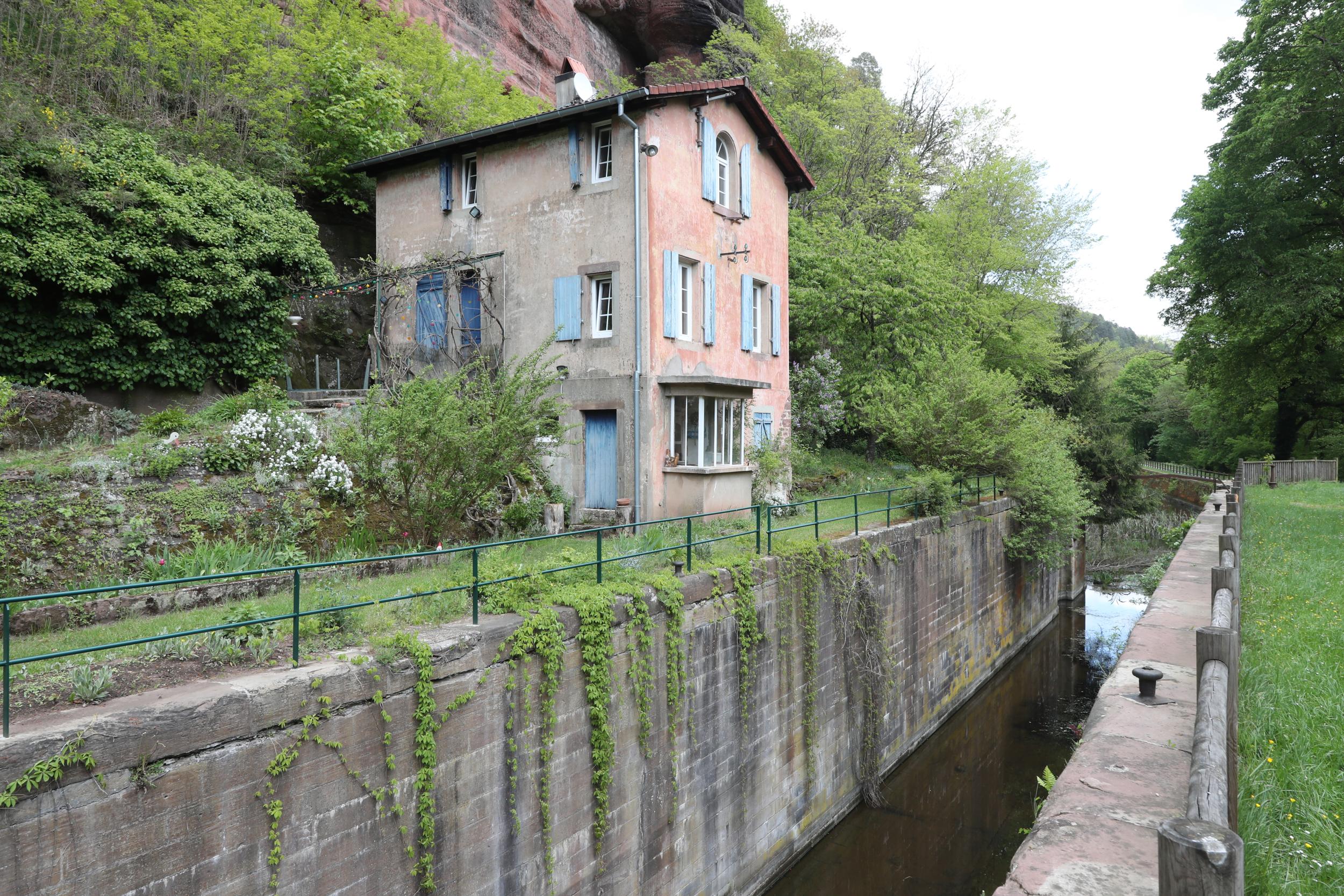 Het huis naast de sluis staat vlak voor een rotsformatie van rode steen. Het is een prachtige omgeving om te wandelen of te fietsen.