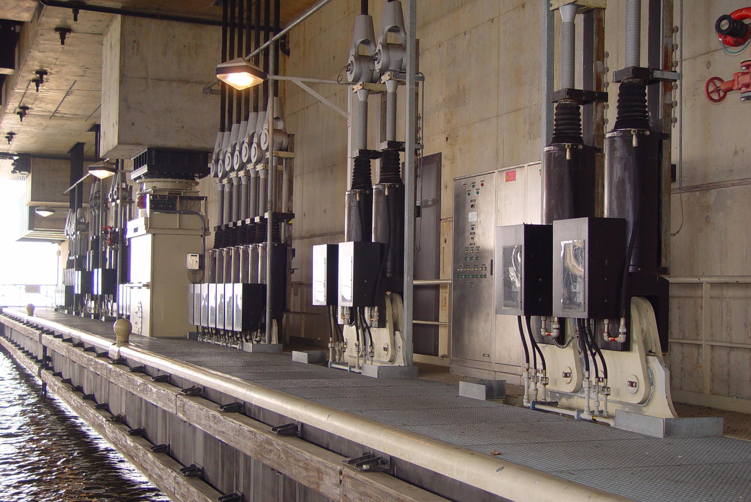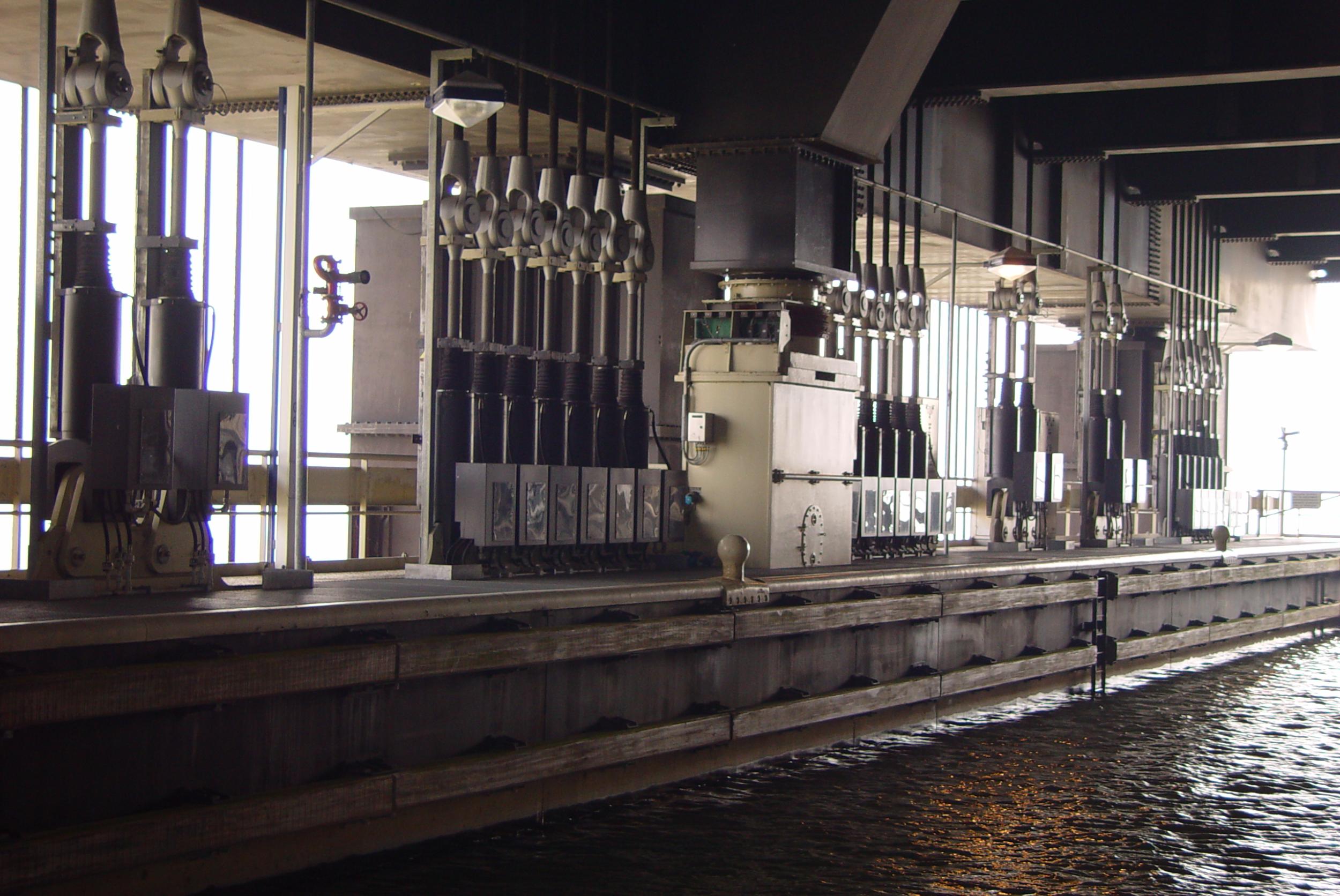 De scheepslift heeft twee onafhankelijke bakken. Elke bak hangt via 144 staalkabels aan 8 contragewichten, vier aan beide kanten van de bak. Boven de bak in de machinekamer drijven vier elektromotoren via een rondlopende as meerdere vertragingsbakken aan die de beweging van de bak voor hun rekening nemen.