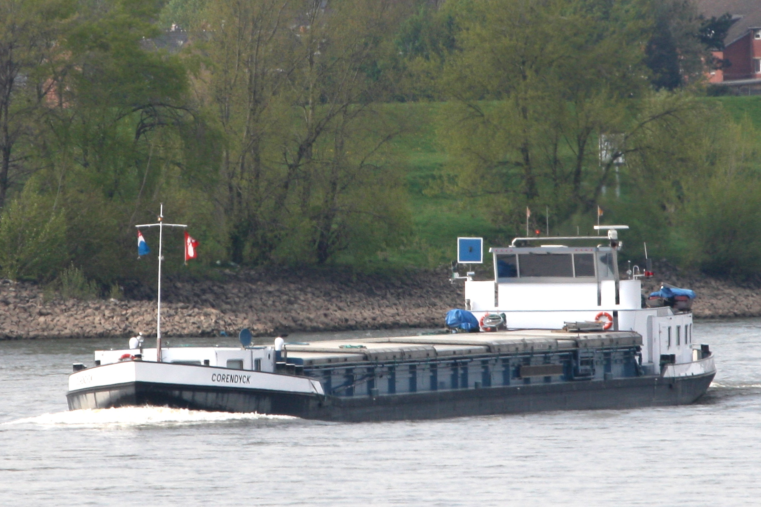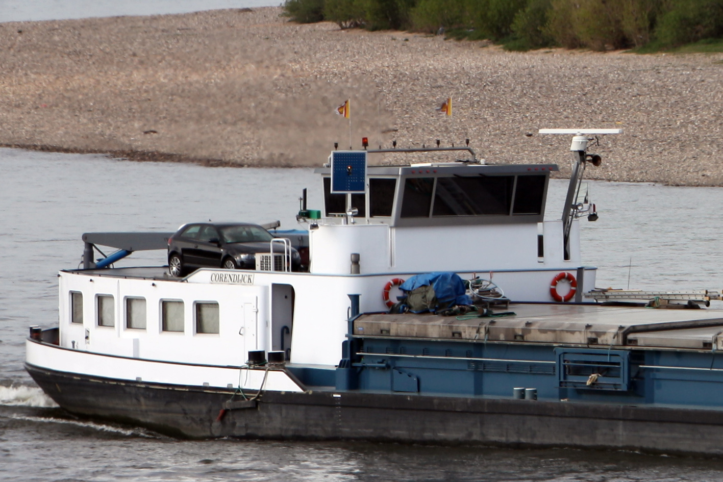 Een blauwe vlag of een blauw bord betekend dat schepen zich stuurboord op stuurboord passeren. Normaal gesproken is er net als in het wegverkeer rechts houden de regel. In het waterverkeer kan het voornamelijk op rivieren voorkomen dat de opvaart de kanten opzoekt waar de minste stroming is om snelheid te houden. Zo kan het dus voorkomen dat links houden minder tegenstroom heeft en zo dus economischer is om stroomopwaarts te varen. Schepen voeren dan overdag een blauw bord en 's nachts een wit knipperlicht. De afvarende schepen weten dan welke zijde van het opvarende schip vrij is om te passeren.