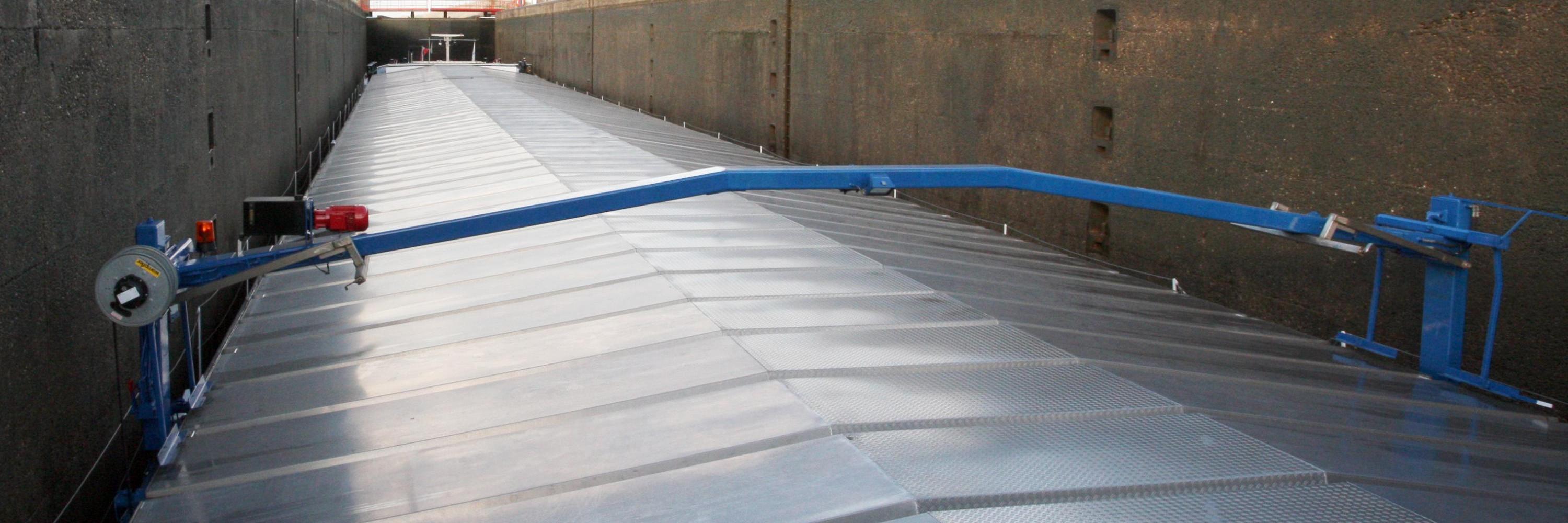Een luikenkar is een machine voor het oppakken en horizontaal verplaatsen van aluminium Friesekap luiken van een droge ladingschip.