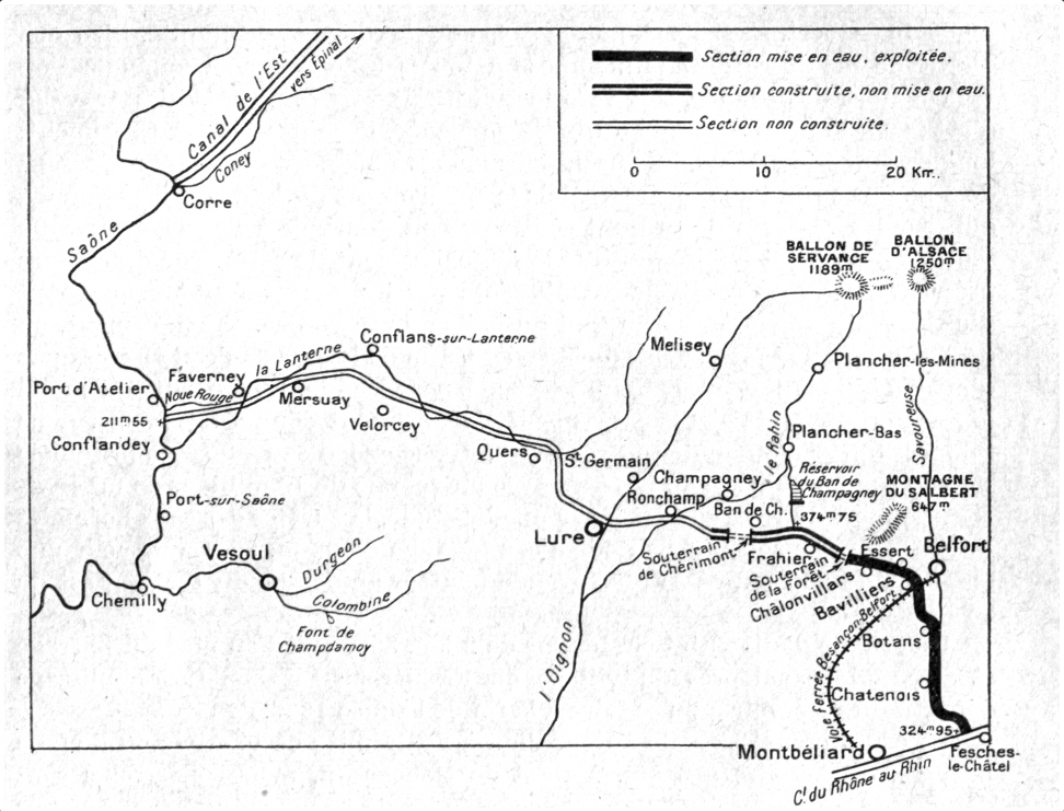 In 1871 werd het Canal de l'Est (nu Vogezenkanaal) gegraven om transport tussen Nancy en Bourgogne mogelijk te maken. De bouw van het Canal de Montbéliard à la Haute-Saône de begon gelijktijdig met het Canal de l'Est om de Saône met de Moezel te verbinden. Het Vogezenkanaal werd in 1887 geopend.