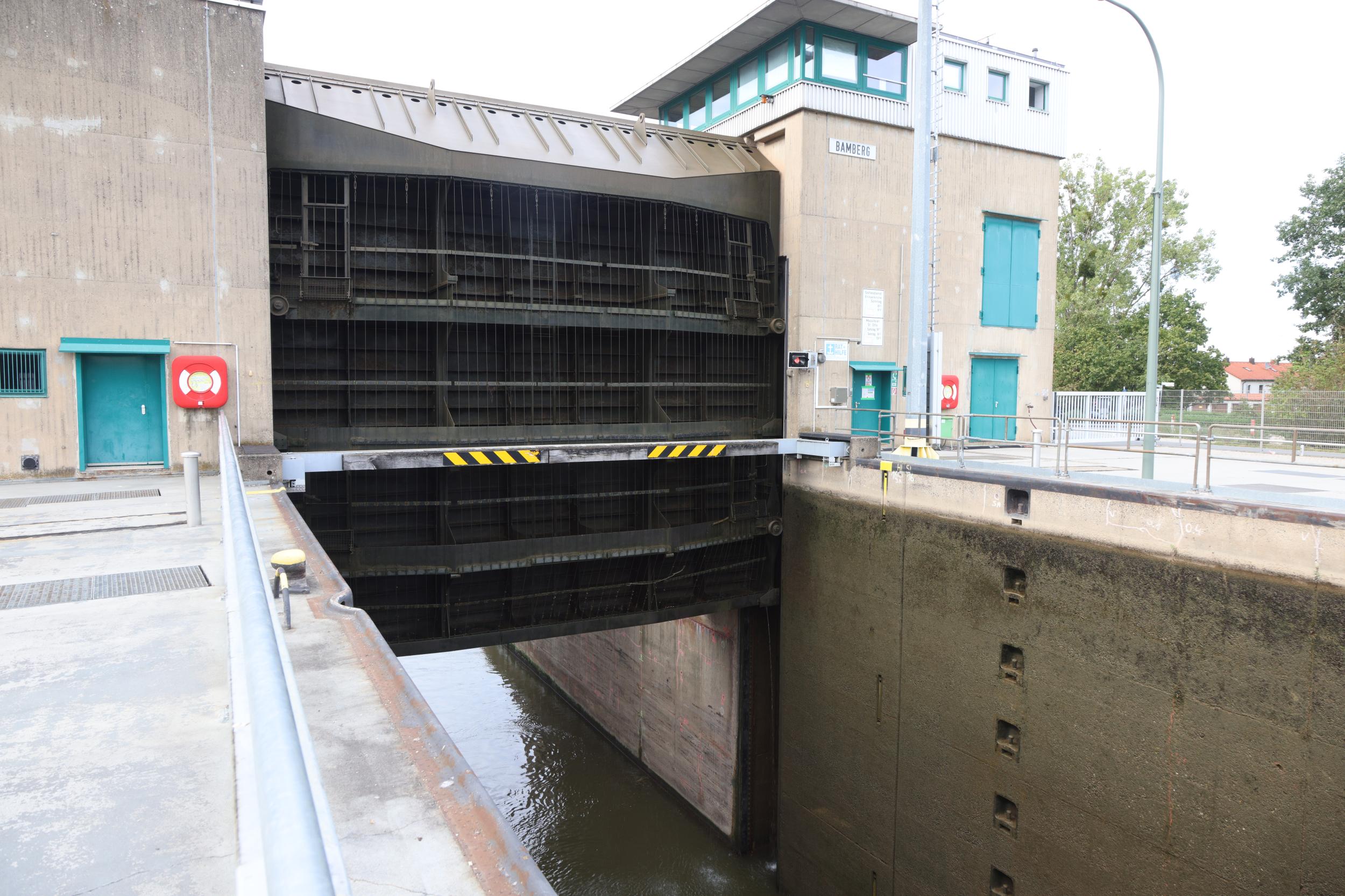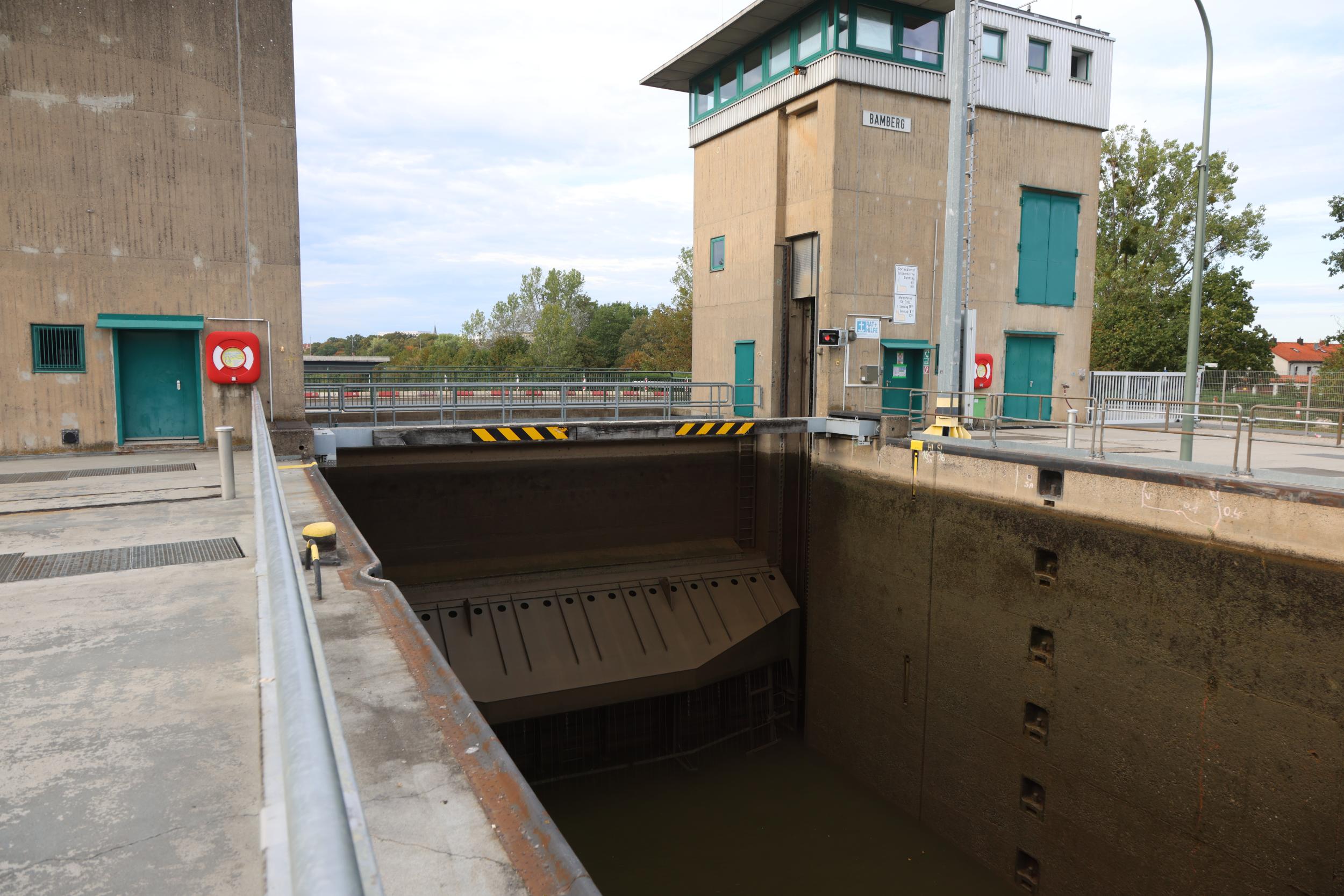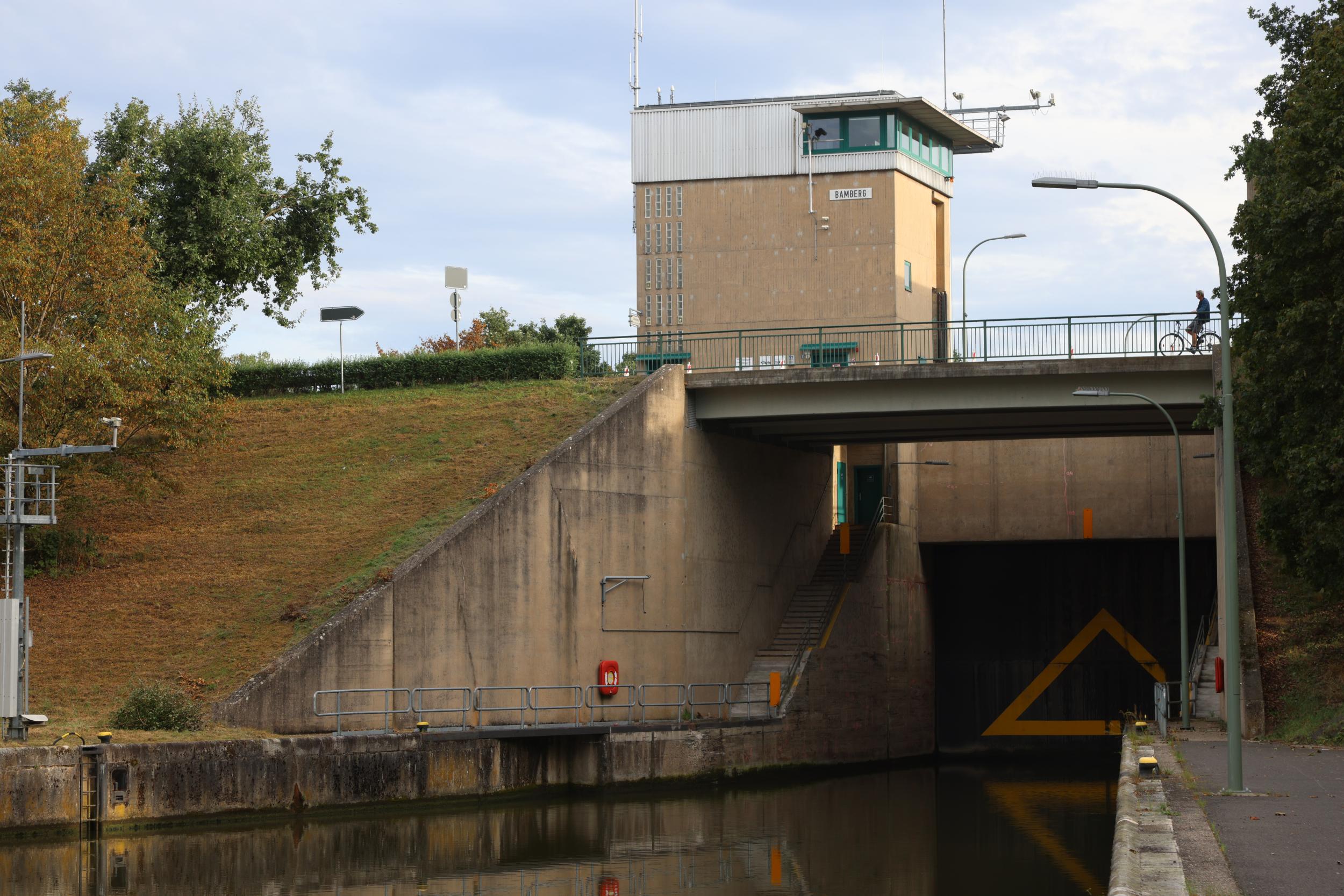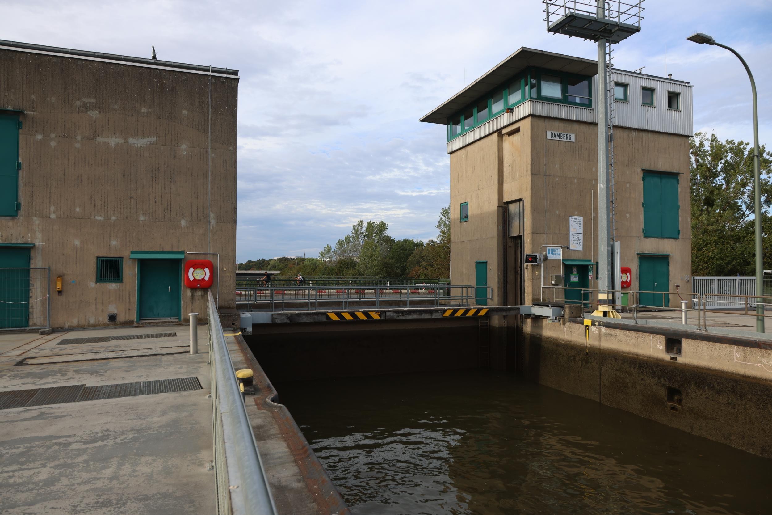 In Duitsland zelf is de sluis bekend als Schleuse Bamberg. De sluis heeft het grote verval van 10.94 meter. een sluis, een vaste brug