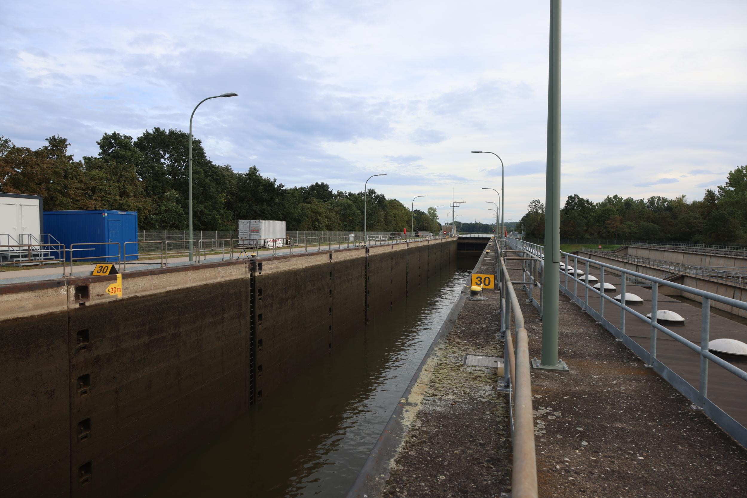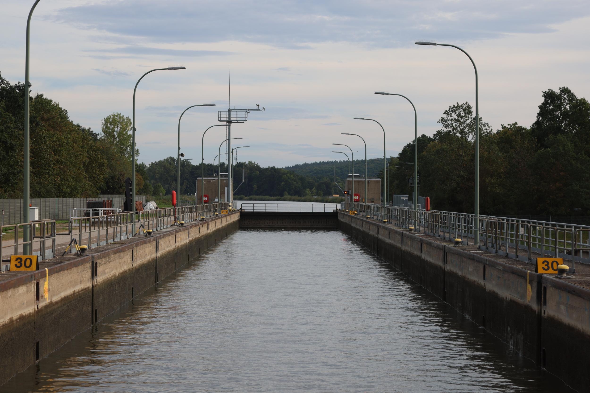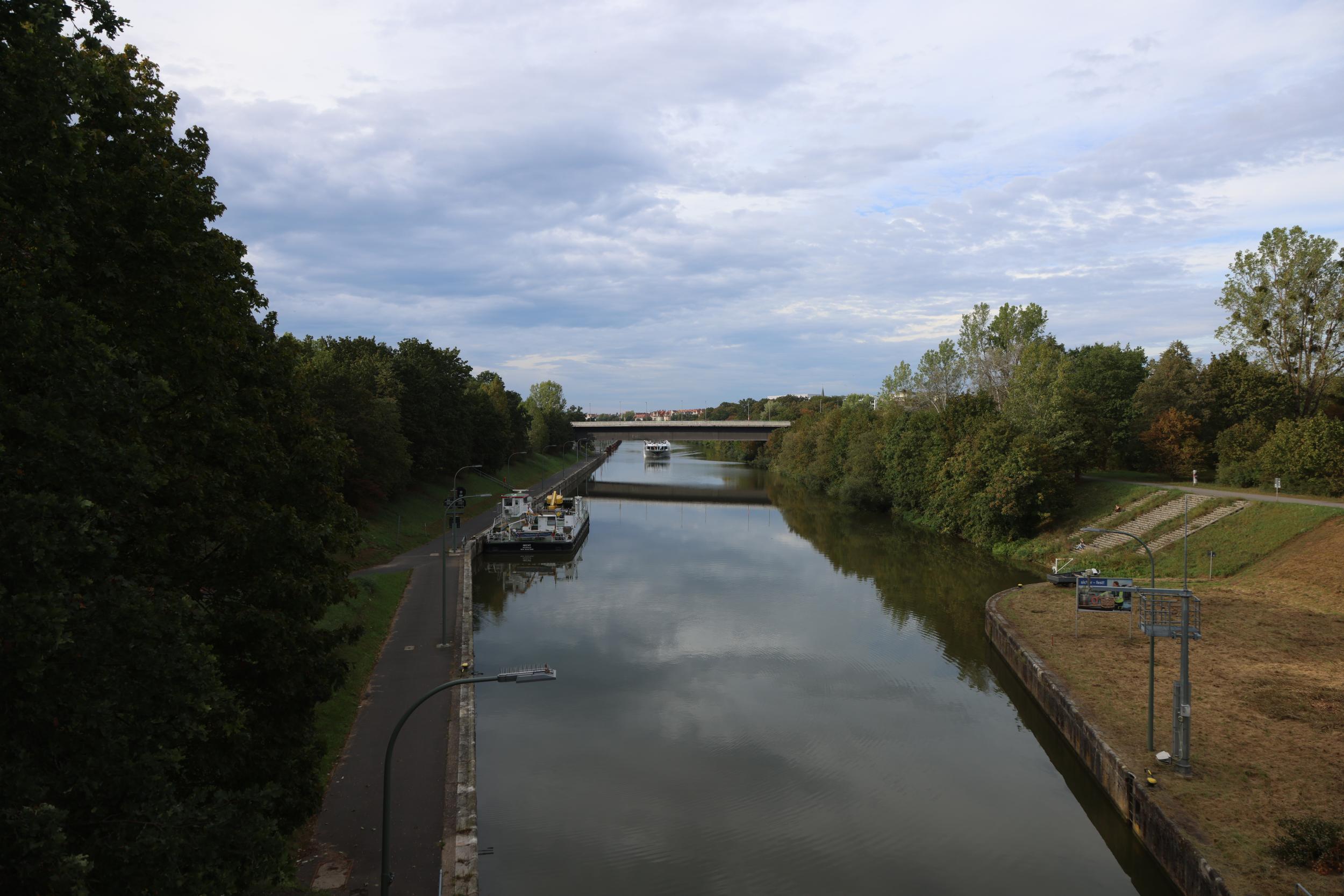 In Duitsland zelf is de sluis bekend als Schleuse Bamberg. De sluis heeft het grote verval van 10.94 meter. een sluis, een vaste brug